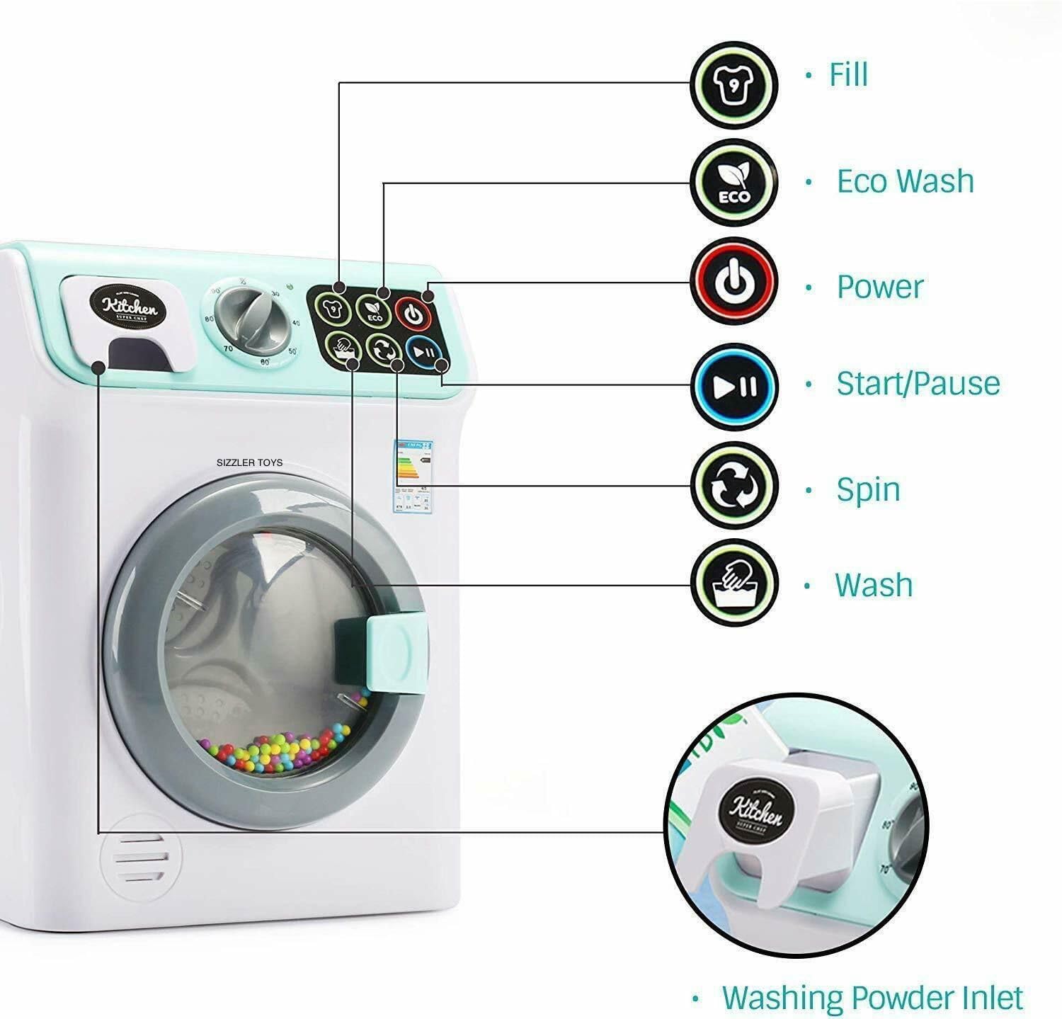 - Realistic functions and sounds! – sounds of water, washing, spinning and more!